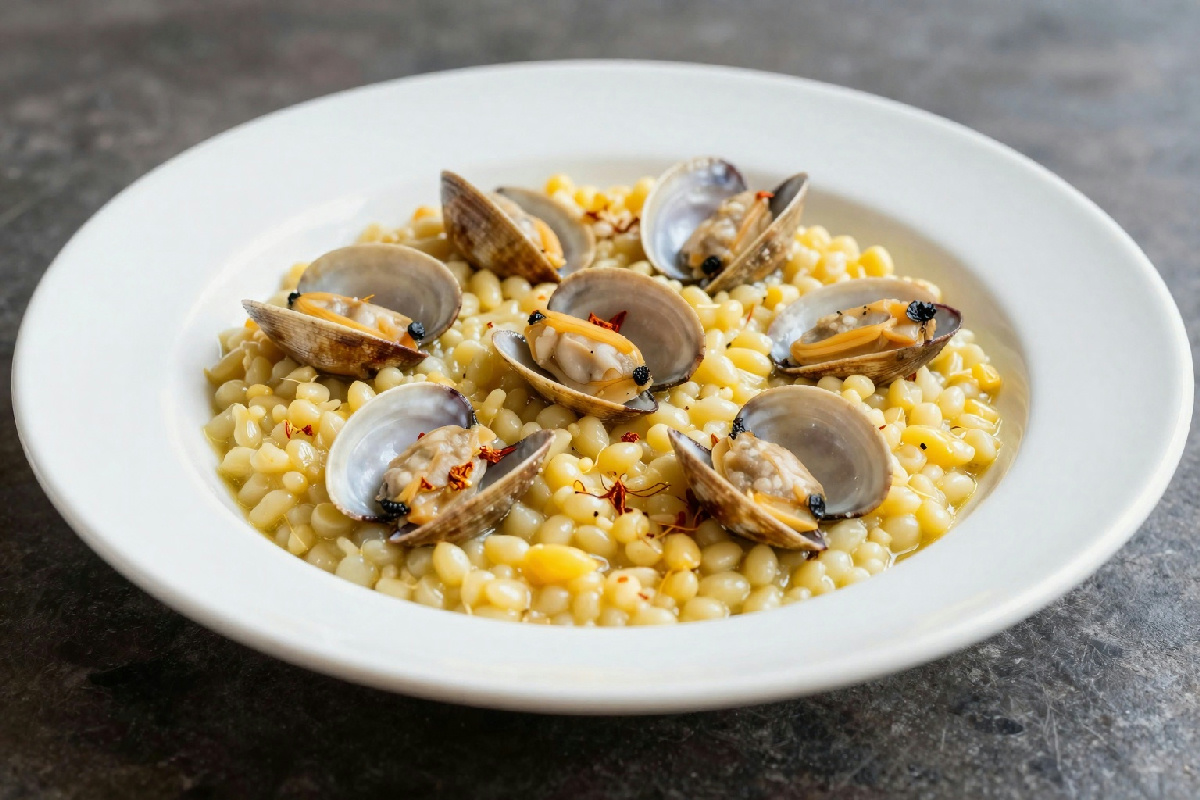 Fregola risottata allo zafferano, vongole e ricotta salata