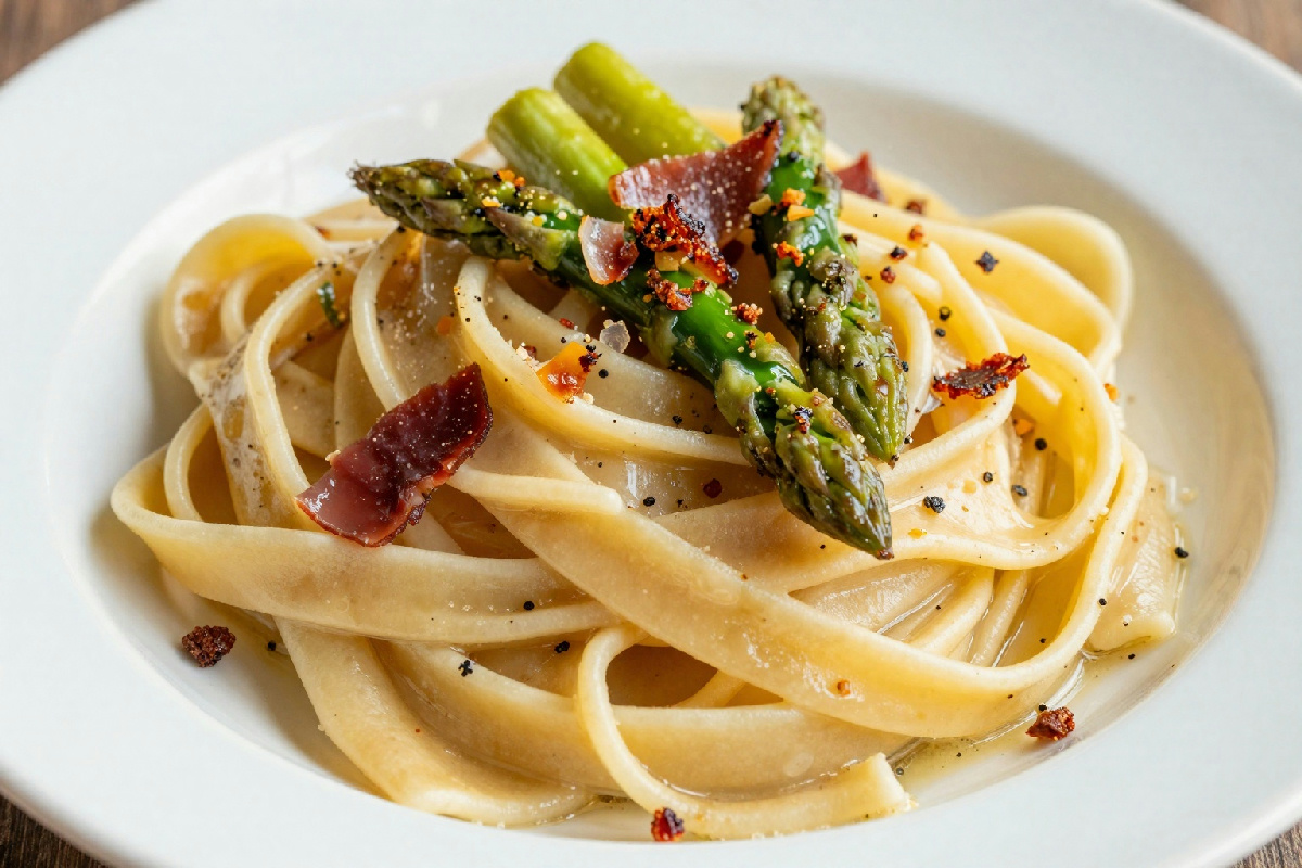Pasta fresca con asparagi di stagione e speck croccante, un piatto semplice e gustoso da preparare